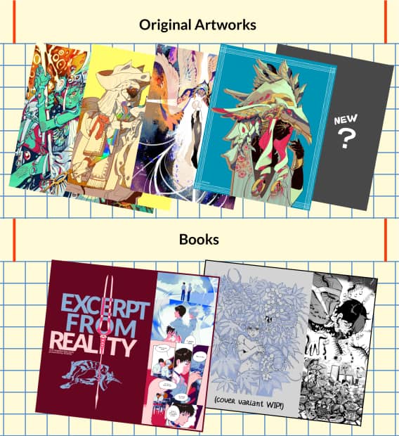 Original Artworks: Postcards to A3 prints. Books: Evangelion fancomic, and 'Insect Course' Comic ('Côn Trùng Thực').